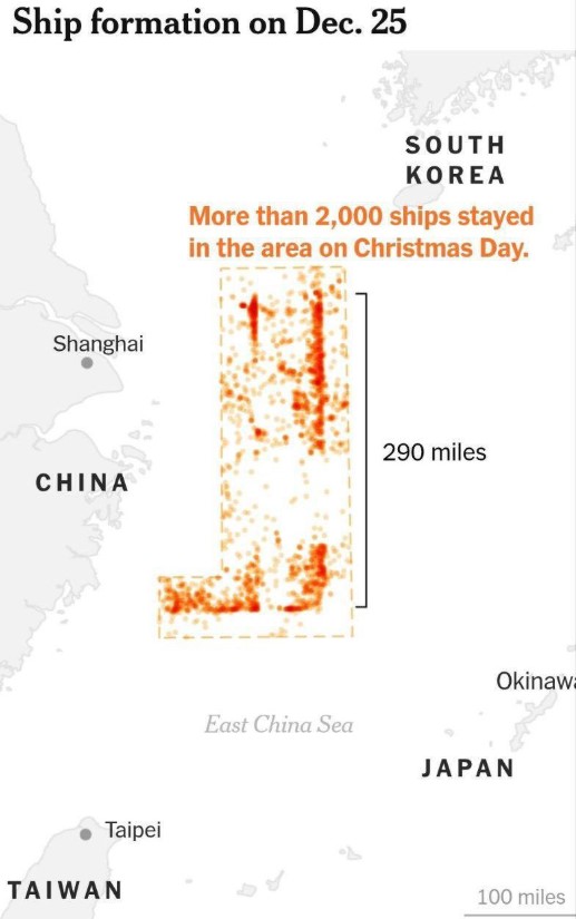 去年12月25日,约2000艘中国大陆渔船在东海排成倒L字形的两条平行线,每条长约290英里。图/撷自@visegrad24在X的照片