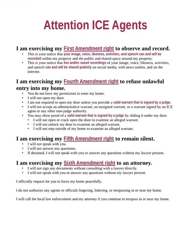 艾莉制作的英文传单,以便应对ICE上门查访。