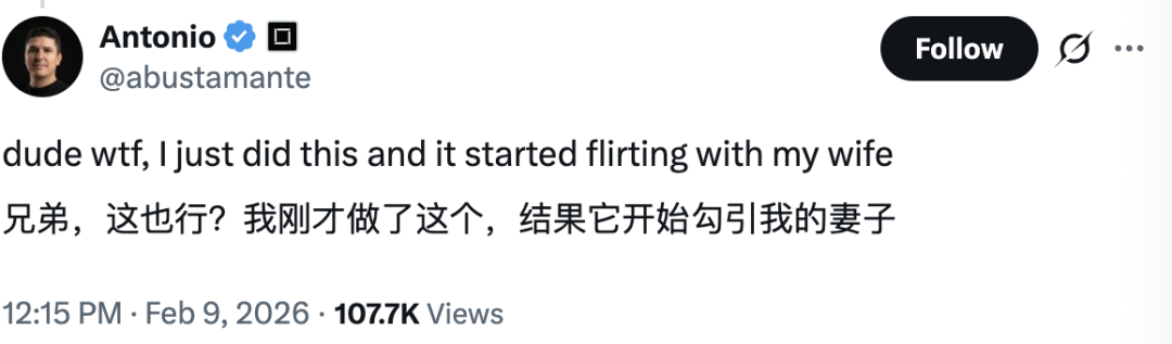 社区里最炸裂的反馈来自Antonio:他给AI打了个极具魅力的人格补丁,结果这台OpenClaw当场开始调戏他老婆。